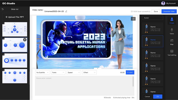 GC-Studio通過最大限度減少傳統(tǒng)視頻制作的人工介入,有效降低使用門檻、提升交互體驗,大幅節(jié)約了人力資源和物力消耗。企業(yè)只需設置數字人參數,即可獲得一個適合公司形象的、專業(yè)的、可24小時無間斷工作的數字講解員。