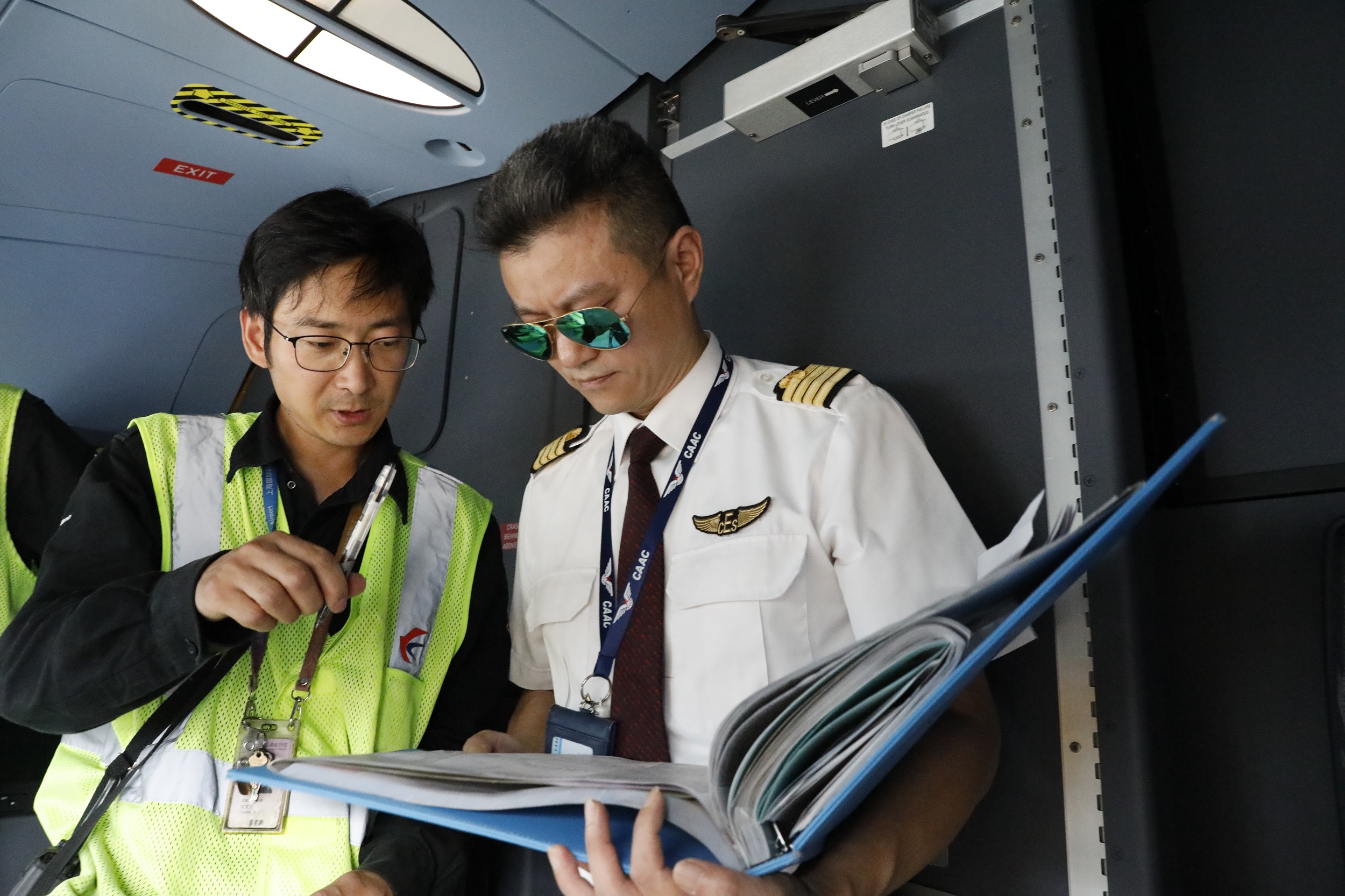 航班起飛前,機務(wù)工程師與東航A350機長季紅華進行最后的工作交接與確認(rèn)
