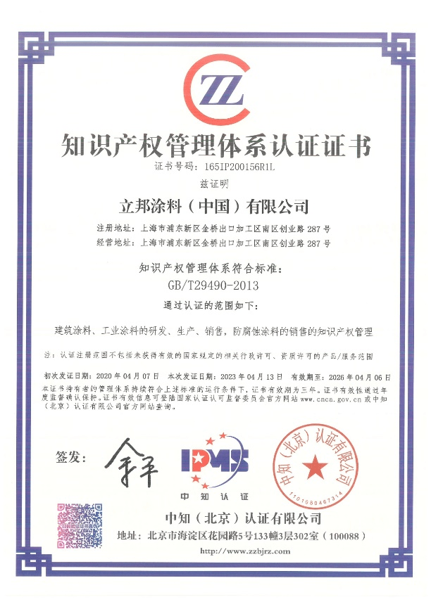 有力支持全面創(chuàng)新”為主題的2023年全國知識產(chǎn)權宣傳周活動[1]正如火如荼地進行。作為創(chuàng)新驅(qū)動型企業(yè),立邦始終注重知識產(chǎn)權的管理和保護,以此保障嚴謹?shù)募夹g研發(fā)工作,穩(wěn)步提升自主創(chuàng)新能力。近日,立邦順利通過國家知識產(chǎn)權管理專業(yè)機構評審,再次獲得《知識產(chǎn)權管理體系認證證書》,為自身進一步規(guī)范知識產(chǎn)權管理,增強核心競爭力打下了堅實的基礎。