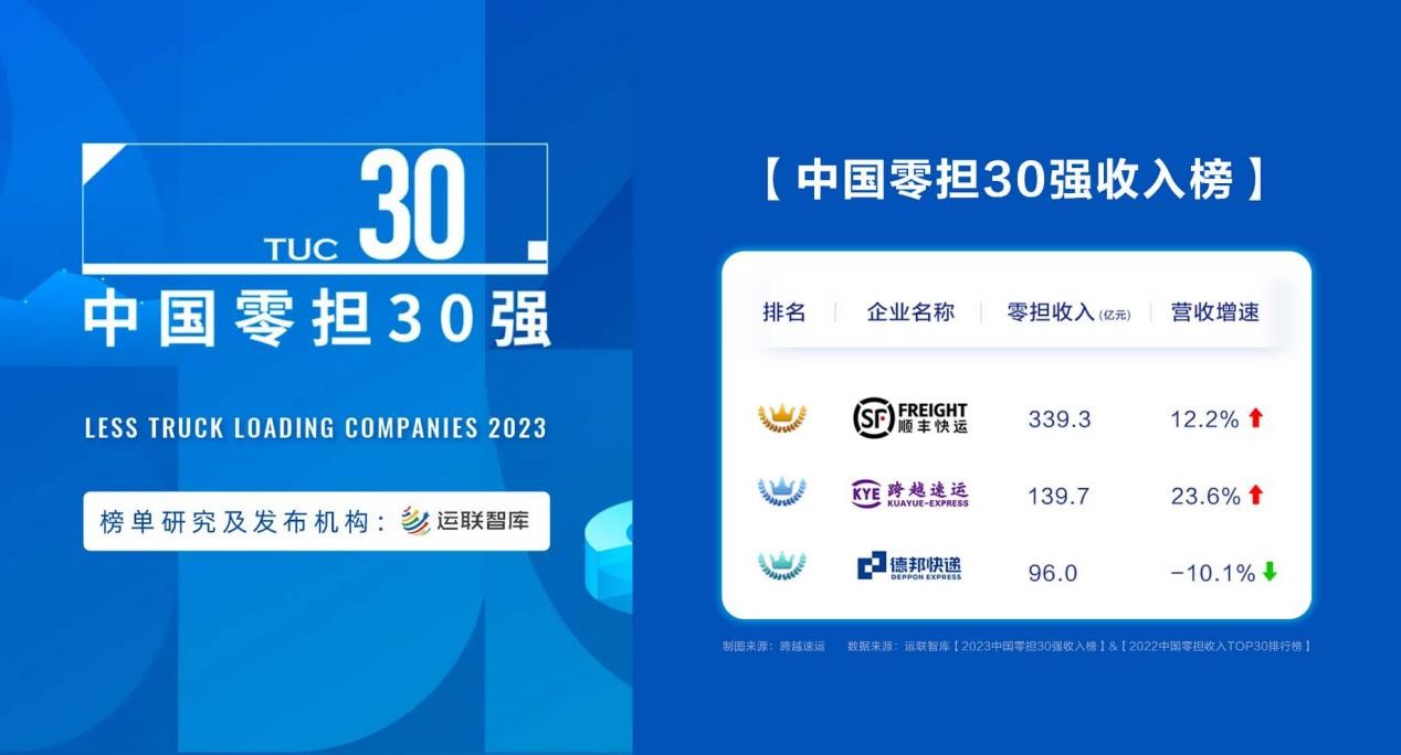 但,過去的16年時間里,就在大家認為快遞領域的競爭進入白熱化階段的時候,跨越卻加速崛起“后來居上”。8月9日,運聯(lián)智庫頒布2023中國零擔排行榜,跨越以139.7億總營收蟬聯(lián)榜單第二名(第一是順豐,第三是德邦),營收增速逆勢提升到23.6%,領跑榜單三甲企業(yè)(順豐12.2%,德邦-10.1%)。