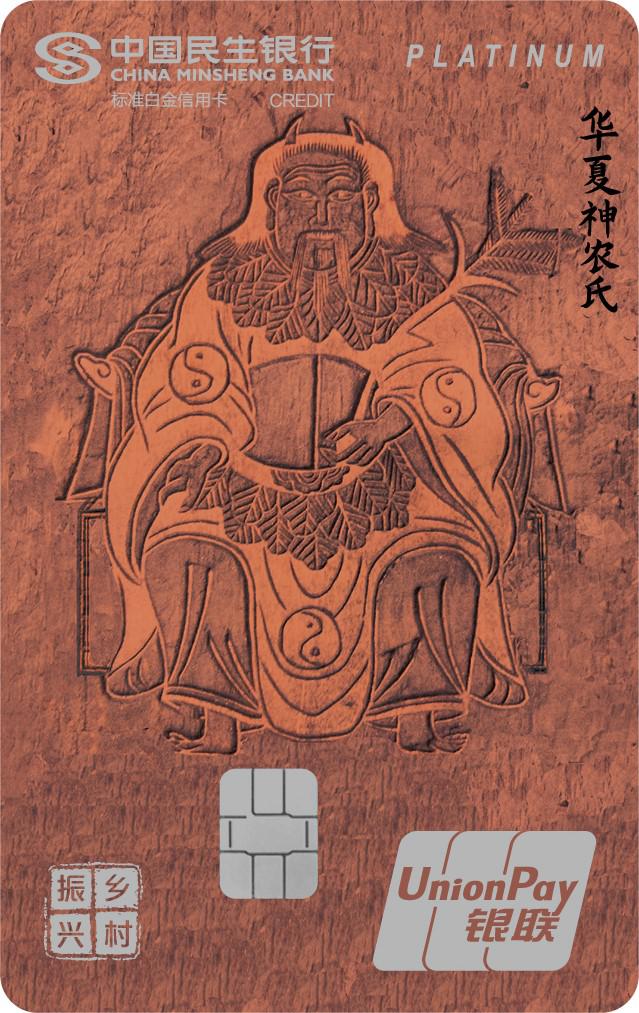 該卡首次采用民生銀行定點幫扶縣——河南省滑縣國家級非遺木版年畫為版面,卡面以華夏神農(nóng)氏為主形象,形象地描繪出農(nóng)耕文化和民族風情,展現(xiàn)了中華傳統(tǒng)美術工藝,為金融機構助力鄉(xiāng)村振興又添碩果。