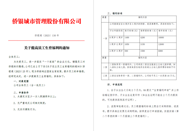 近日,一份僑銀股份新出臺(tái)的《關(guān)于提高員工生育福利的通知》流出,瞬間爆火全網(wǎng)引發(fā)熱議,網(wǎng)友紛紛大呼“神仙公司還招人嗎?”“報(bào)上地址,讓我來!”