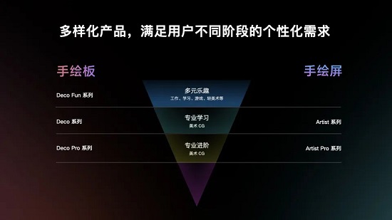 目前,XPPen 共有 2 大品類,5 大系列產(chǎn)品,包括數(shù)位板類的 Deco Fun、Deco、Deco Pro 系列及數(shù)位屏類 Artist、Artist Pro 系列產(chǎn)品。其中,Deco Fun 產(chǎn)品線系列面向多元樂趣用戶;Deco 和 Artist 產(chǎn)品線系列面向?qū)I(yè)學(xué)習(xí)用戶;Deco Pro 和 Artist Pro 產(chǎn)品線系列面向?qū)I(yè)進階用戶。全新的產(chǎn)品布局,可針對不同成長階段的用戶需求,打造從興趣入門到專業(yè)學(xué)習(xí)再到專業(yè)進階的產(chǎn)品矩陣。