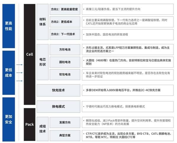 材料從根本上決定著電池性能。通過改進(jìn)材料提高電池性能、優(yōu)化電池老化機(jī)制、應(yīng)用新型材料、改變電芯結(jié)構(gòu)是電芯研發(fā)的主要方向。 例如,材料體系方面,采用新型材料體系(高鎳正極、硅基負(fù)極、鋰金屬負(fù)極、固態(tài)電解質(zhì)等),提高單體能量密度;或者研制出磷酸錳鐵鋰,探索鈉離子電池的商業(yè)化應(yīng)用,降低成本;或者加快固態(tài)電池的研發(fā)進(jìn)程,使電池性能更高,更耐久。電芯形狀方面,方形電池,尤其是LFP短刀兼顧性能、集成與制造,成為主流企業(yè)的優(yōu)選方案之一;大圓柱電池也是熱門方向,特斯拉和寶馬均已提出具體的實(shí)施規(guī)劃。快充技術(shù)方面,多家主機(jī)廠開始導(dǎo)入800V高電壓平臺,并聯(lián)合電池企業(yè)推出2C~4C快充方案。