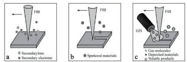 FIB-SEM示意圖,與聚焦離子束的三種工作模式 a.成像;b.加工;c.沉積 來源:蔡司,NE時(shí)代整理
