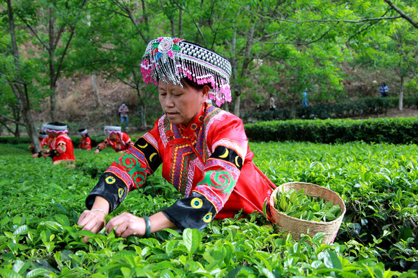 安石村村民在茶地里采茶。黃建林 攝