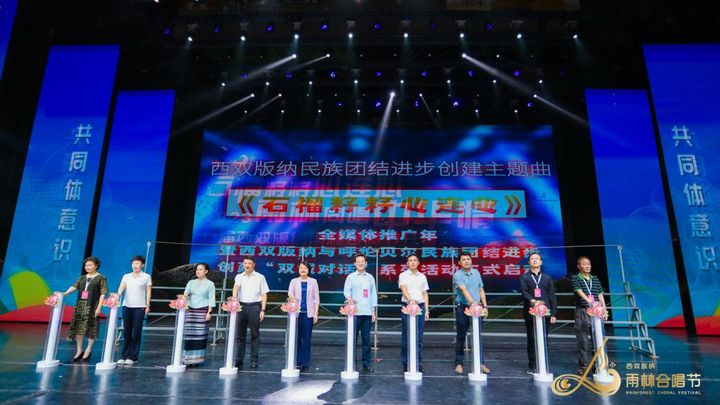 開幕式上,南疆與北疆,西雙版納與呼倫貝爾,以“中華民族一家親,同心共筑中國夢”為總目標,以首屆西雙版納雨林合唱節(jié)為契機,開啟兩地“雙城(民族團結)對話”,打造“民族團結+文化旅游”創(chuàng)新發(fā)展模式。中共西雙版納州委副書記、州委統(tǒng)戰(zhàn)部部長王嘉玲等領導為“西雙版納民族團結進步創(chuàng)建主題曲《石榴籽籽心連心》全媒體推廣年、西雙版納與呼倫貝爾民族團結進步創(chuàng)建“雙城對話”系列活動”進行了創(chuàng)意啟動。