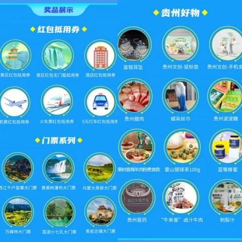 本次盲盒活動(dòng)獎(jiǎng)品重點(diǎn)突出貴州省內(nèi)景點(diǎn)、文創(chuàng)產(chǎn)品、特色美食。從貴州重點(diǎn)景區(qū)如西江千戶苗寨、黃果樹(shù)瀑布、烏蒙大草原、荔波小七孔的大門(mén)票,到苗銀耳墜、貴州臘肉、蠟染絲巾、貴州波波糖、貴州苗藥等貴州好物,好玩、好吃、好用一應(yīng)俱全。此外,盲盒還提供景區(qū)、酒店、機(jī)票、火車票、打車紅包抵用券,誠(chéng)意滿滿。