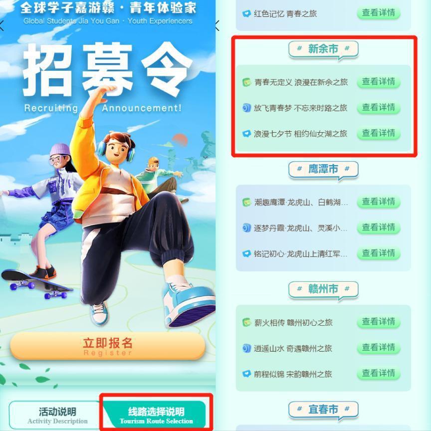 報(bào)名信息由活動(dòng)主辦方審核,從中選取30—50人作為“嘉游贛·青年體驗(yàn)家”,邀請(qǐng)來余參加出征儀式,贈(zèng)送全套旅行裝備,免費(fèi)體驗(yàn)新余精品旅游路線。