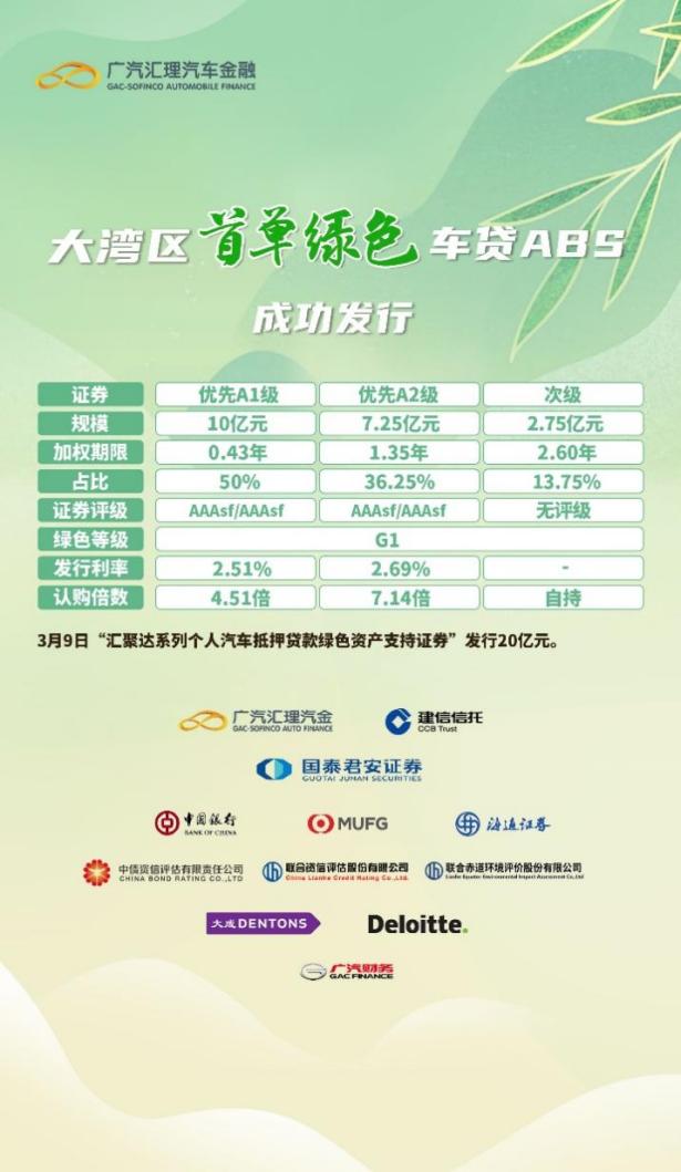 與此同時(shí),廣汽匯理良好的綠色金融資產(chǎn)也獲得了資本市場(chǎng)的認(rèn)可。今年3月9日,廣汽匯理發(fā)行了粵港澳大灣區(qū)首單綠色車(chē)貸ABS——匯聚達(dá)2023年第一期個(gè)人汽車(chē)抵押貸款綠色資產(chǎn)支持證券。本次入池資產(chǎn)均為廣汽埃安品牌新能源汽車(chē)個(gè)人貸款,經(jīng)綠色認(rèn)證機(jī)構(gòu)聯(lián)合赤道評(píng)估分析,入池資產(chǎn)對(duì)應(yīng)的新能源汽車(chē),預(yù)計(jì)每年可實(shí)現(xiàn)二氧化碳減排6.07萬(wàn)噸,節(jié)約標(biāo)準(zhǔn)煤2.85萬(wàn)噸,有效地助力了我國(guó)節(jié)能減排事業(yè)開(kāi)展。