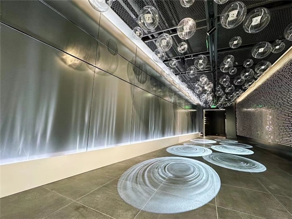 【水影】長(zhǎng)廊通過(guò)水滴掛墜、漣漪投影及名言墻打造沉浸式光影體驗(yàn)