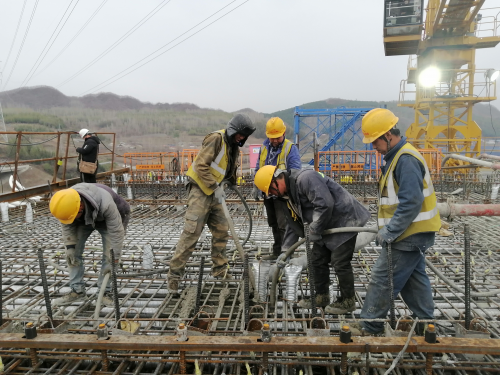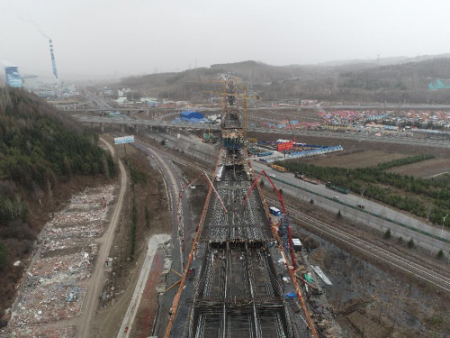 圖為沈白高鐵建設(shè)中的白山渾江特大橋,該橋是全線控制性工程,全橋長1499.5米,全橋共有鉆孔樁588根,橋墩臺56個,大跨度連續(xù)梁3個,道岔連續(xù)梁1個,正在澆筑混凝土的是道岔連續(xù)梁和10號墩0#塊。該橋先后跨越渾江、輝臨高速公路及G201國道,涉臨近鐵路既有線施工,安全風(fēng)險高,施工難點多。