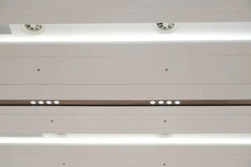 三層交通廳,位于會(huì)議中心的兩翼,聯(lián)通展廳、公共通道及休息區(qū)域上層空間為玻璃采光頂,精致的走線輔以200余盞筒燈,創(chuàng)造獨(dú)特的建筑感觀。