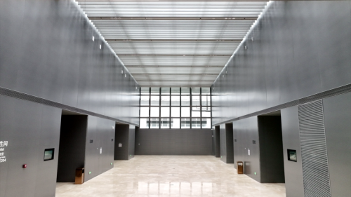 凈高8.3米的室內(nèi),古銅不銹鋼墻面,超高干掛式硬包,以及高大古樸的仿銅門(mén),凸顯恢宏大氣的廳內(nèi)空間。