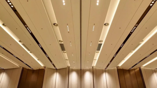 會(huì)議門(mén)廳,與兩側(cè)VIP前室相連,向北聯(lián)通室外廣場(chǎng),挑高最高處達(dá)24米,采用香檳金色蜂窩鋁板,整體造型呼應(yīng)建筑鳳“翼”舒展的形態(tài),向北廣場(chǎng)方向傾斜5°。