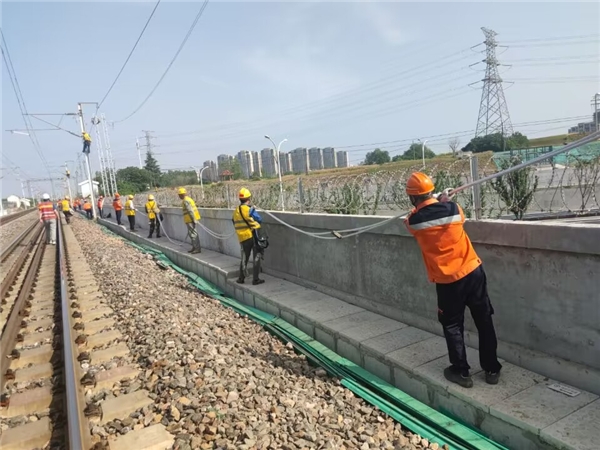隨著作業(yè)人員默契配合下,起錨、放線、滑輪懸掛固定、落錨等各個工序有序推進,中國中鐵電氣化局運管公司上海維管處合肥維管段橫跨包公大道供電線恢復(fù)架設(shè),標志著淮南線接觸網(wǎng)遷改施工進入最后階段。