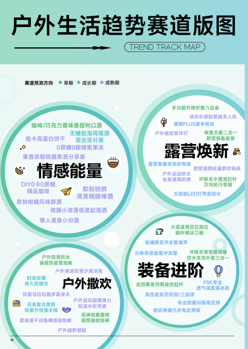 巨量算數(shù) & 算數(shù)電商研究院綜合趨勢賽道評估模型,篩選出了 38 個戶外生活行業(yè)趨勢賽道,覆蓋運動用品、戶外用品、箱包、方便食品、酒飲等多板塊,我們認(rèn)為推動品類的創(chuàng)新力集中在功能創(chuàng)新、場景創(chuàng)新和情感創(chuàng)新。
