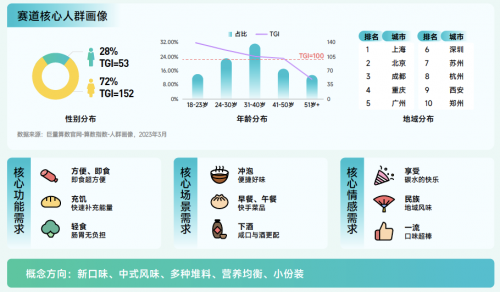 方便食品賽道解讀:2022年3月-2023年4月間搜索量同比增長 829.6%,遠(yuǎn)高于行業(yè)整體,月度趨勢波動攀升。女性為主,31-40 歲人群占比高;集中在一二線城市。方便食品由于其便宜、快速和方便,逐漸成為出行必備品。正所謂,方便生活,小包裝,大營養(yǎng)。在戶外出行中,方便食品助你享受更加自由、無拘束的旅程。