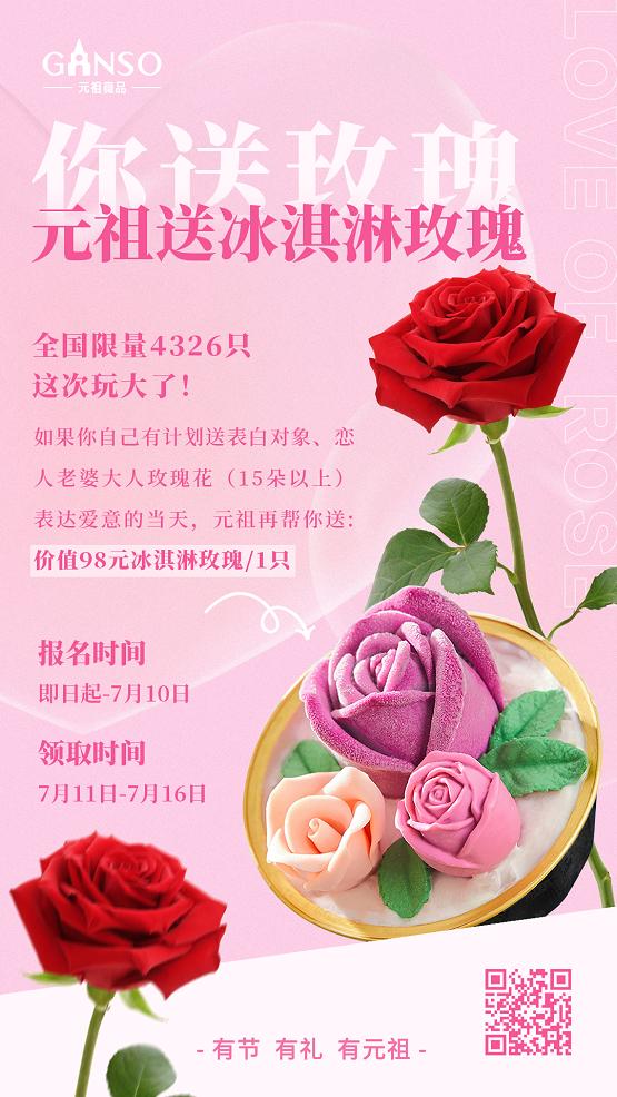 你送玫瑰,元祖送冰淇淋玫瑰,全國限量4326只!如果你有計劃送表白對象、戀人、妻子玫瑰花(15朵以上)表達愛意,元祖當天再幫你送價值98元冰淇淋玫瑰。此活動一經發(fā)布,元祖粉絲紛紛報名參與,迅速在社交媒體上掀起了一股“浪漫熱潮”!