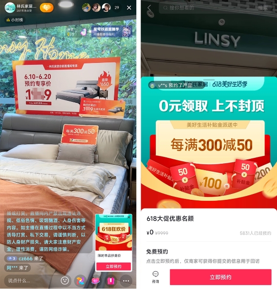 為此,在大促期間,林氏家居特意通過凸顯活動優(yōu)惠的多種物料增加直播間大促氛圍 ,利用一目了然的優(yōu)惠信息吸引用戶駐足,借助包括商品介紹、稀缺性優(yōu)惠劵推介等標(biāo)準(zhǔn)化、模塊化的直播話術(shù),強調(diào)活動優(yōu)惠信息,加速產(chǎn)品種草,引導(dǎo)用戶領(lǐng)取優(yōu)惠進行留資,線下到店購買商品。