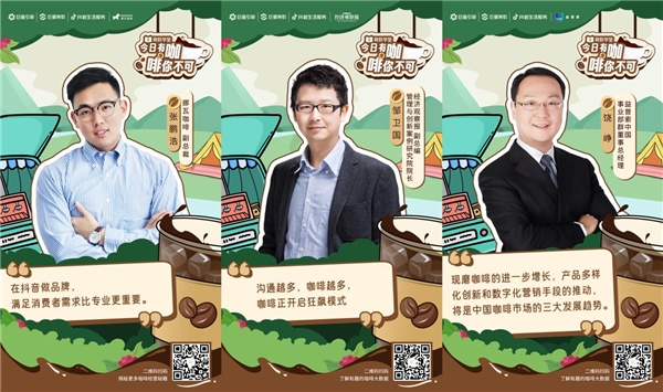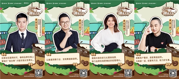 為此《算數(shù)學(xué)堂》重磅推出《今日有咖·啡你不可》欄目,聚焦咖啡賽道,為品牌商家們指點(diǎn)迷津,并邀請(qǐng)了8位重磅嘉賓,專業(yè)覆蓋咖啡生態(tài)各個(gè)環(huán)節(jié),包括消費(fèi)行業(yè)專家2位、咖啡品牌商家代表2家、品牌代理服務(wù)商1家、抖音生活服務(wù)專家2位、巨量引擎商業(yè)分析1位,他們將分別從各自的領(lǐng)域出發(fā),分享有關(guān)咖啡行業(yè)未來趨勢(shì)、品牌經(jīng)營(yíng)方法論、抖音平臺(tái)數(shù)字化營(yíng)銷秘籍等真知灼見。