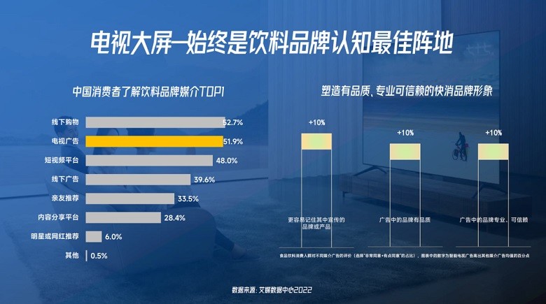 根據(jù)艾媒數(shù)據(jù)中心2022的統(tǒng)計(jì)分析,電視廣告是中國消費(fèi)者了解飲料品牌的第一媒介,是建設(shè)飲料品牌認(rèn)知的最佳陣地,有助于塑造高品質(zhì)、可信賴的品牌形象。