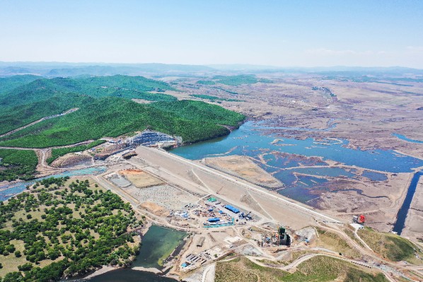 內(nèi)蒙古引綽濟(jì)遼工程加緊推進(jìn)。圖為引綽濟(jì)遼工程文得根水利樞紐施工現(xiàn)場(chǎng)。新華社記者 劉磊 攝