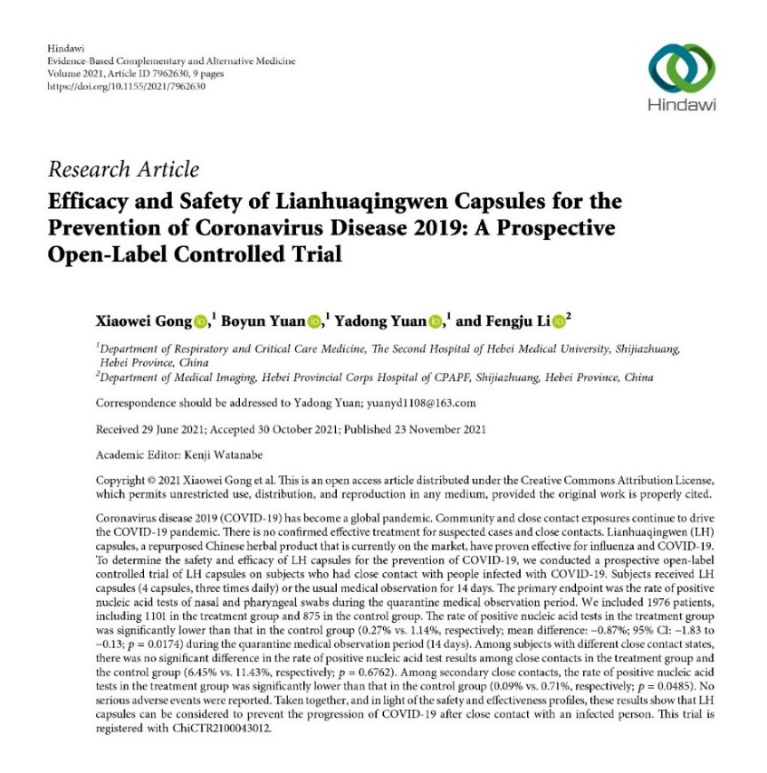 本次連花清瘟膠囊針對新冠病毒肺炎密切接觸者預(yù)防效果開展的真實世界研究,選取了1976例與新冠肺炎感染者有密切接觸的受試者,分為連花清瘟治療組(1101例)和對照組(875例)給予對照試驗,并于14天后檢測鼻咽拭子核酸檢測陽性率。結(jié)果顯示治療組核酸檢測陽性率顯著低于對照組(0.27%vs.1.14%),同時用連花清瘟膠囊預(yù)防新冠具有良好的安全性。在醫(yī)學(xué)隔離觀察期間,試驗人員還發(fā)現(xiàn),連花清瘟治療組的癥狀發(fā)生率顯著低于對照組,特別是能顯著降低發(fā)熱的發(fā)生率,再次印證了其對新冠肺炎的治療效果。這也是首個證明連花清瘟膠囊在新冠密切接觸者中的預(yù)防有效性和安全性的臨床試驗,不僅為密切接觸者的有效防治提供了新方案,也為臨床預(yù)防用藥提供了真實世界證據(jù)支持。