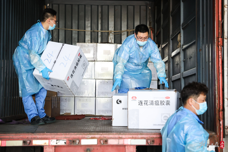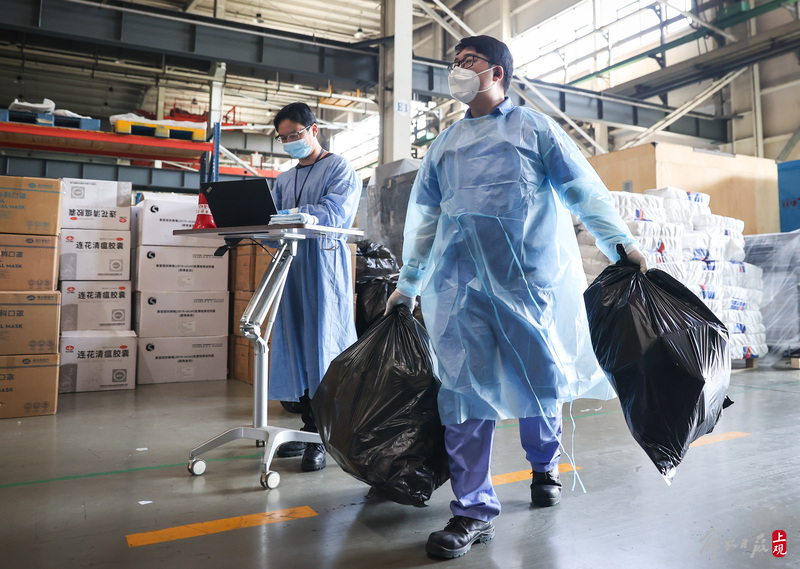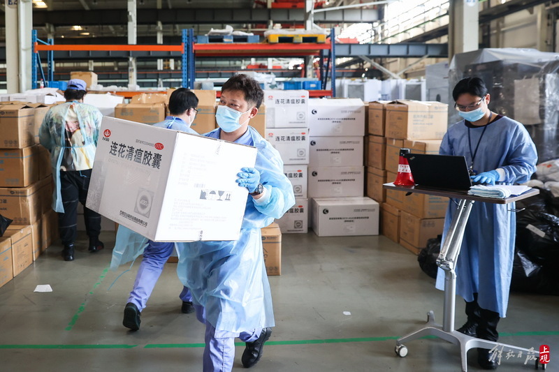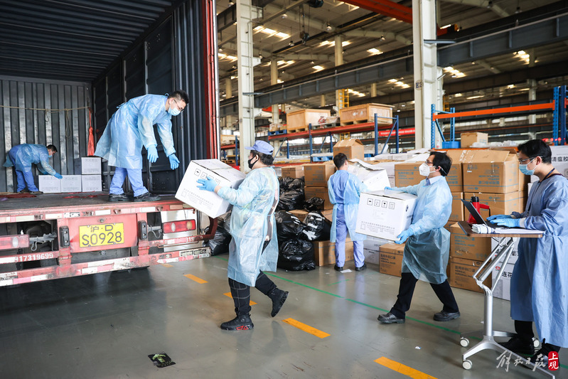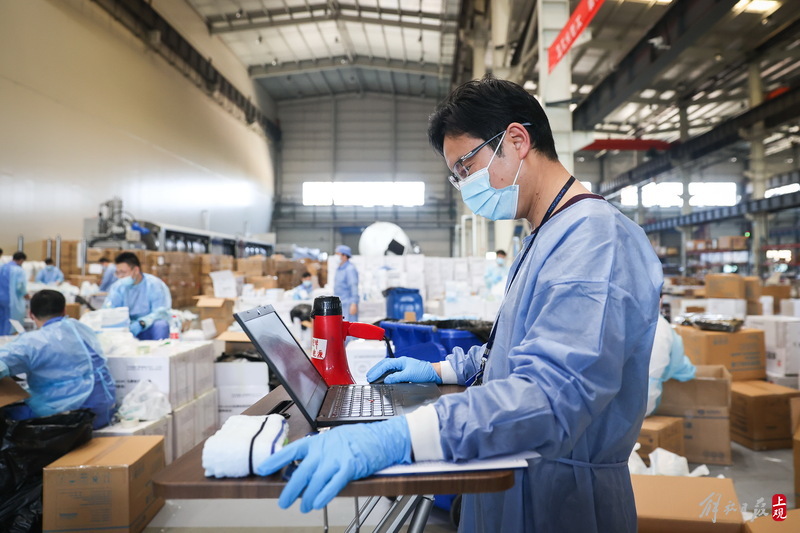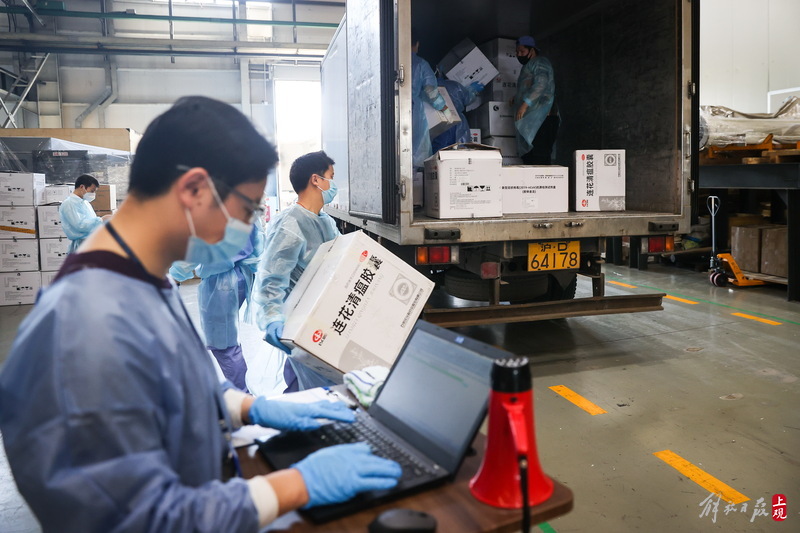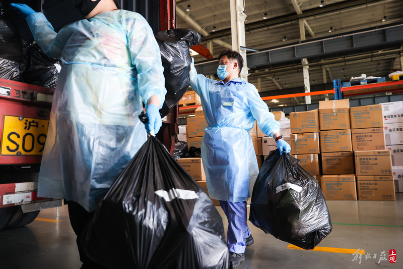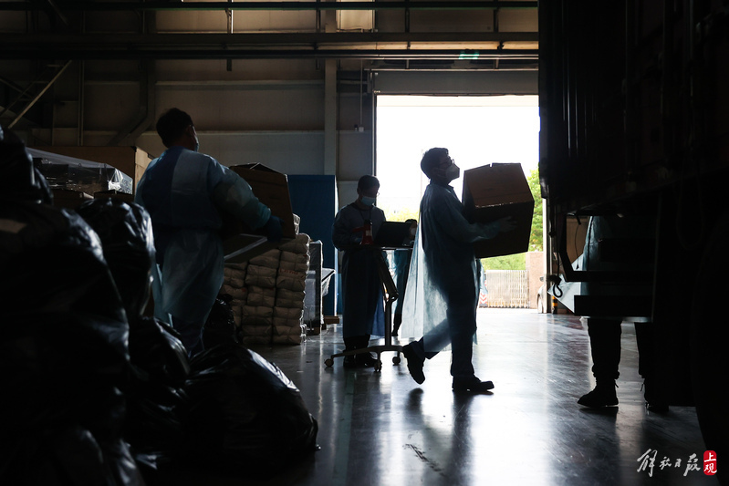為不增加基層負擔(dān),寶山區(qū)啟用7個分揀點對應(yīng)13個街鎮(zhèn)園區(qū),由招募來的企業(yè)職工及志愿者流水線作業(yè),對物資開展卸貨、分裝。