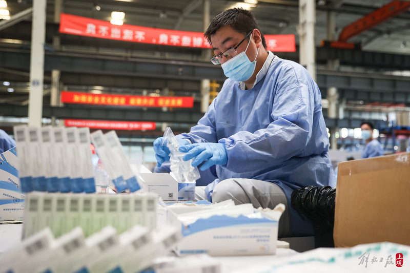 2022年4月11日,上觀新聞記者來到業(yè)績路上的寶山防疫服務(wù)包最大的分裝車間,這里原本是上海漢虹精密機械有限公司的生產(chǎn)廠房,但該廠百余名志愿者從早上八點就開始分批次投入到了防疫物資的分裝“流水線”作業(yè)中,一張張清單核對,一件件物資分裝,現(xiàn)場熱火朝天。