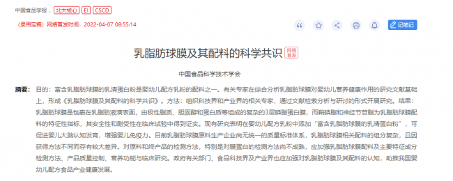 4月7日,《中國食品學(xué)報》刊發(fā)中國食品學(xué)界剛剛?cè)〉玫囊粋€突破性科學(xué)共識成果——中國工程院院士、中國農(nóng)業(yè)大學(xué)營養(yǎng)與健康研究院院長任發(fā)政等近20位中國食品科學(xué)技術(shù)學(xué)會權(quán)威專家形成了國內(nèi)首個《乳脂肪球膜及其配料的科學(xué)共識》(以下簡稱“乳脂肪球膜科學(xué)共識”),共識明確指出,嬰幼兒配方乳粉添加“富含乳脂肪球膜的乳清蛋白粉”后可促進(jìn)嬰兒大腦認(rèn)知發(fā)育、增強(qiáng)嬰兒免疫力。