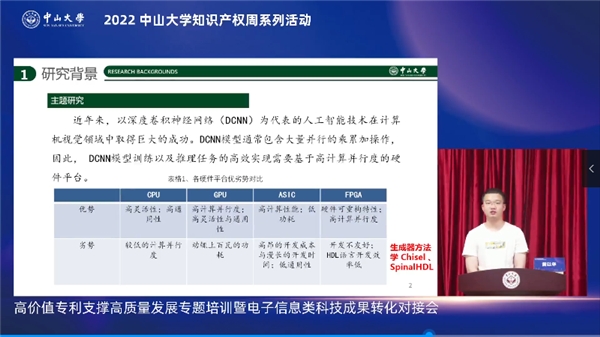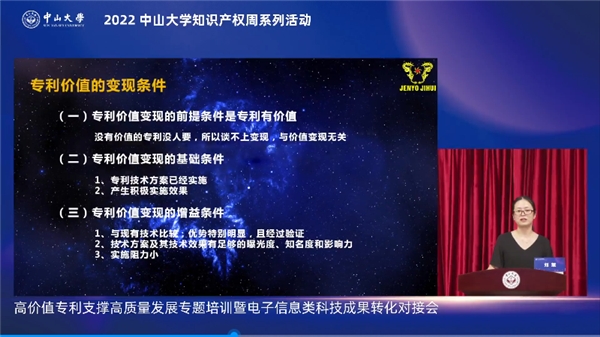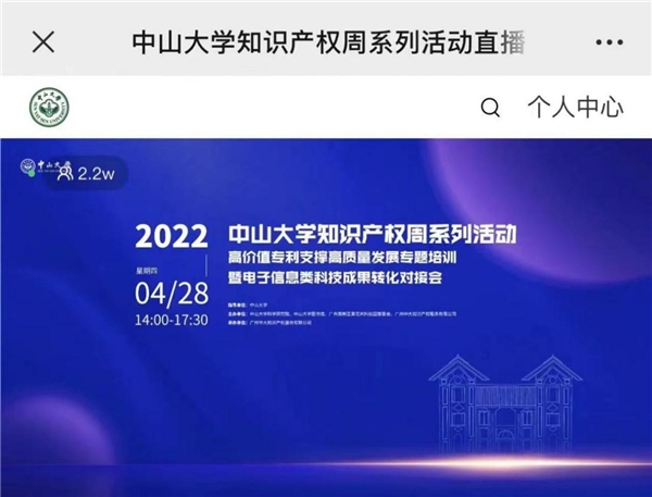 2022年4月28日,在中山大學(xué)的全程指導(dǎo)及越秀區(qū)政府的鼎力支持下,中山大學(xué)科學(xué)研究院、廣州高新區(qū)黃花崗科技園管委會、中山大學(xué)圖書館、廣州中大知識產(chǎn)權(quán)服務(wù)有限公司共同成功主辦中山大學(xué)知識產(chǎn)權(quán)周系列活動高價值專利支撐高質(zhì)量發(fā)展專題培訓(xùn)暨電子信息類科技成果轉(zhuǎn)化對接會。本次活動采取線上方式開展,邀請兩位業(yè)界專家圍繞高價值專利支撐高質(zhì)量發(fā)展做專題報告,多達(dá)178項(xiàng)電子信息類專利項(xiàng)目與83家企業(yè)進(jìn)行了精準(zhǔn)對接,活動在線人數(shù)超2.2萬人,多位知識產(chǎn)權(quán)專家及知名企業(yè)在云端匯聚,助力知識產(chǎn)權(quán)高質(zhì)量發(fā)展。