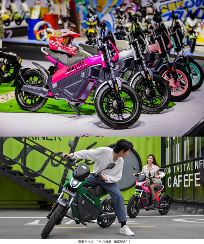 “MI你所愛(ài) 酷馭街頭”MIKU1:設(shè)計(jì)靈感來(lái)自于賽博朋克,極具未來(lái)感的機(jī)車外表,在“后現(xiàn)代迷幻美學(xué)”的賦能下,擁有了更加科幻的潮流美感,瞬間拉近與年輕人的溝通距離;