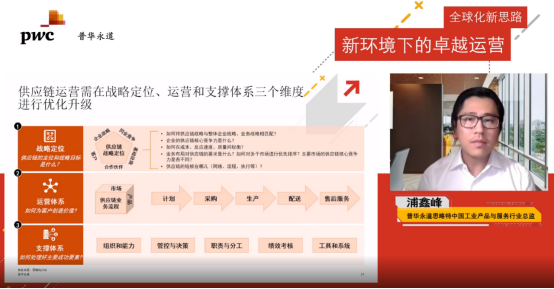浦鑫峰表示,供應(yīng)鏈正成為企業(yè)實(shí)現(xiàn)全球增長(zhǎng)的重要手段之一,呈現(xiàn)全球化、定制化、智能化等發(fā)展趨勢(shì)。聚焦國(guó)內(nèi)眾多出海企業(yè),現(xiàn)有供應(yīng)鏈體系多面臨短期無(wú)法充分滿(mǎn)足海外市場(chǎng)需求、中長(zhǎng)期無(wú)法更好支撐海外業(yè)務(wù)發(fā)展以及全球化對(duì)供應(yīng)鏈運(yùn)營(yíng)提出的更高要求等挑戰(zhàn)。普華永道結(jié)合成功項(xiàng)目經(jīng)驗(yàn)及行業(yè)洞察,幫助企業(yè)通過(guò)對(duì)供應(yīng)鏈戰(zhàn)略定位、運(yùn)營(yíng)體系和支撐體系三個(gè)維度的優(yōu)化升級(jí),打造端到端卓越供應(yīng)鏈運(yùn)營(yíng)能力,提升運(yùn)營(yíng)效率、實(shí)現(xiàn)規(guī)模經(jīng)濟(jì)效益、并優(yōu)化對(duì)海外業(yè)務(wù)的管理和管控,進(jìn)一步推動(dòng)全球化業(yè)務(wù)發(fā)展。