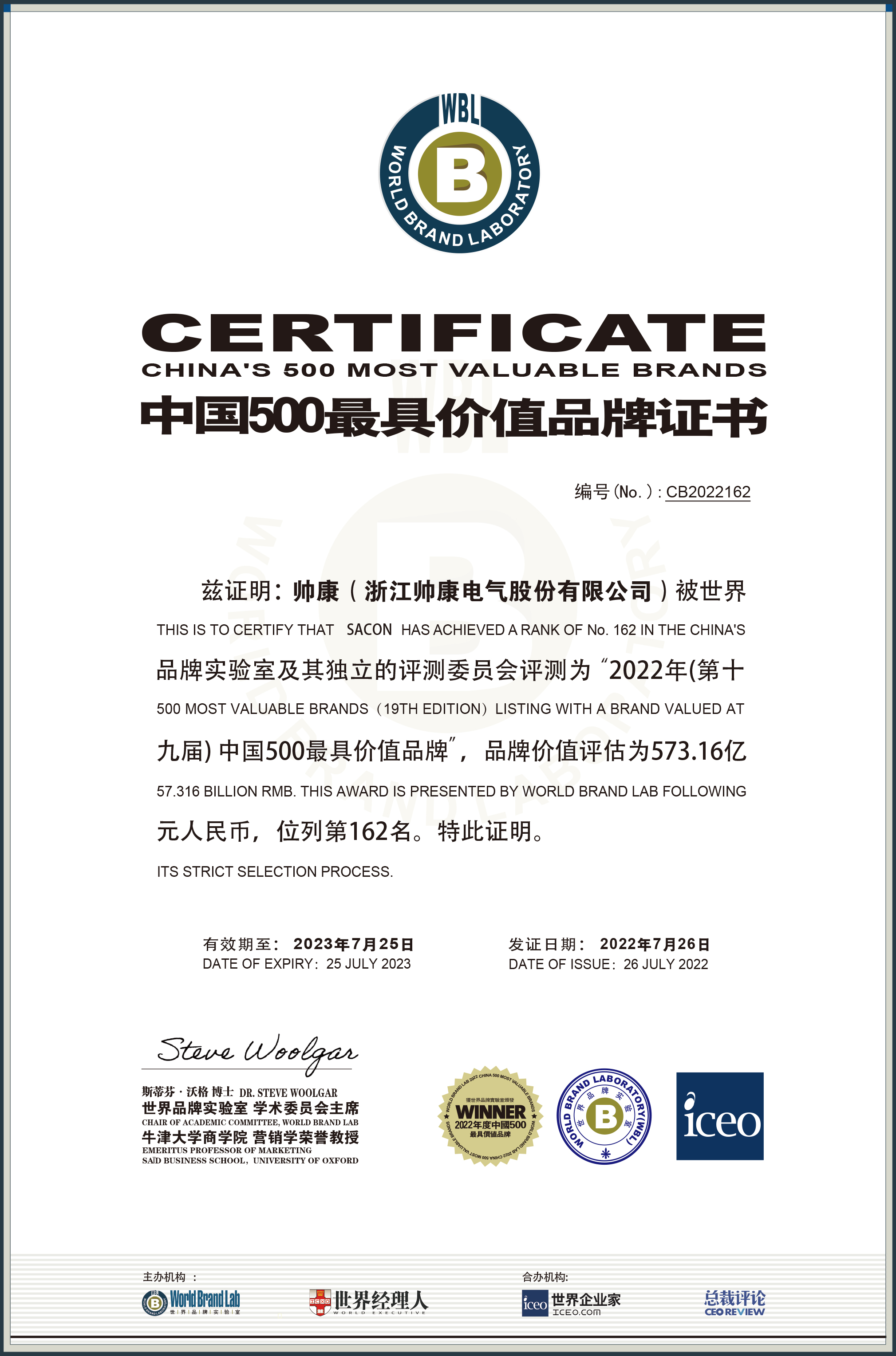 2022年(第十九屆)中國(guó)500最具價(jià)值品牌?證書(shū)