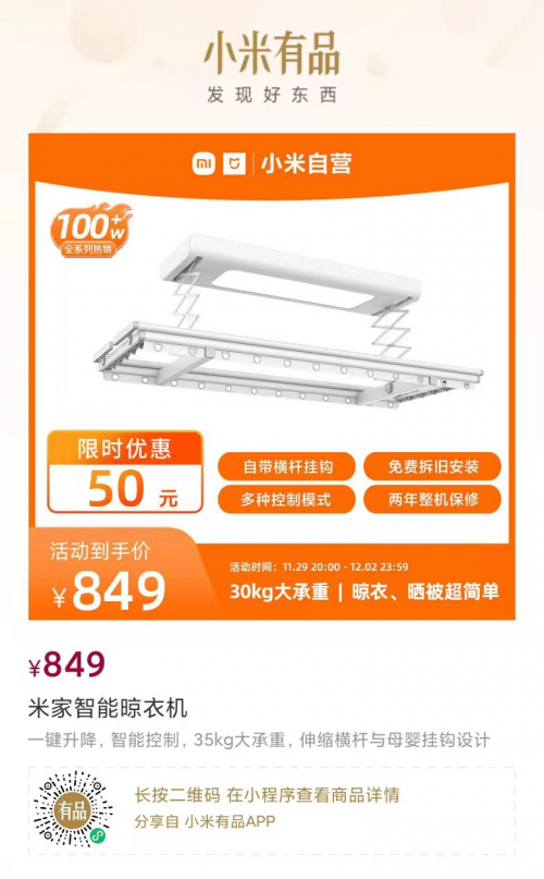 米家智能晾衣機(jī)在2020年5月上市入局智能晾曬行業(yè),短短兩年間達(dá)成100萬的銷量,收獲了百萬用戶的信任,為百萬個(gè)家庭送去了新奇有趣的智能晾曬新體驗(yàn)。在這百萬銷量的背后,離不開小米的超強(qiáng)品牌實(shí)力,更離不開百萬用戶的支持與陪伴。