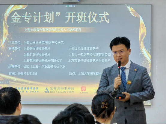 上海段和段律師事務(wù)所知識(shí)產(chǎn)權(quán)中心主任郭國中為“金專計(jì)劃”開班儀式致辭時(shí)表示,非常榮幸參與“金專計(jì)劃”,未來將致力于培養(yǎng)更多專利代理實(shí)務(wù)人才。