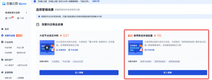 針對(duì)這些季節(jié)性經(jīng)營(yíng)難題,巨量云圖極速版特別推出“春季上新場(chǎng)景作戰(zhàn)室”(以下簡(jiǎn)稱“作戰(zhàn)室”)。