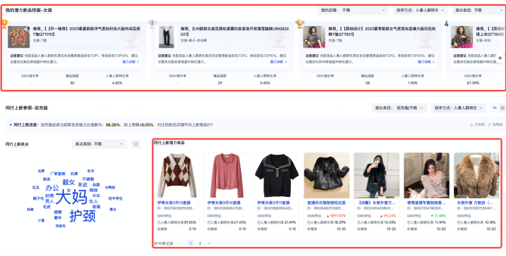供應(yīng)鏈優(yōu)勢(shì)強(qiáng)、跟品速度快的商家,可以通過(guò)“同行上新參照”查看行業(yè)TOP10潛力單品,參考已入春人群轉(zhuǎn)化率、GMV環(huán)比增長(zhǎng)率、價(jià)格帶等因素,綜合判斷確定選品策略;