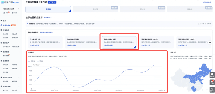 冬春換季,經(jīng)常會(huì)出現(xiàn)氣溫驟升的情況,商家原本的營(yíng)銷策略無(wú)法適應(yīng)市場(chǎng)變化,但又來(lái)不及調(diào)整或者重新制定方案,只有提前預(yù)知流量變化,才能準(zhǔn)確把握上新節(jié)奏,有備而戰(zhàn)。