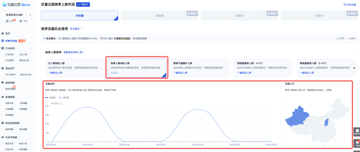 查看“已入春地區(qū)人群”或“即將入春地區(qū)人群”的流量趨勢(shì),提前預(yù)知未來(lái)7天的入春人群規(guī)模,根據(jù)流量變化找到合適的換款時(shí)機(jī)。
