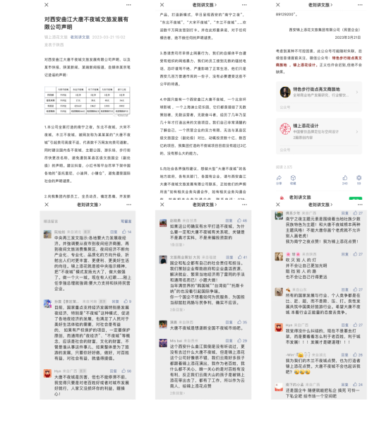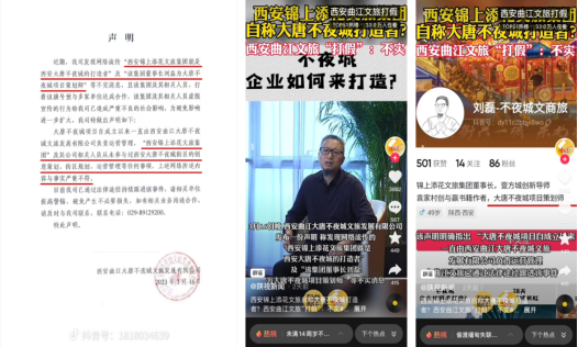2023年3月16日,大唐不夜城官方率先在抖音、曲江文旅、大唐不夜城、曲江文化、微博、西安大唐不夜城等平臺官方認證賬號上全網(wǎng)發(fā)布聲明,該聲明指出:發(fā)現(xiàn)網(wǎng)絡(luò)流傳的“西安“錦上添花”就是西安大唐不夜城的打造者”及“該集團董事長劉磊為大唐不夜城項目策劃師”等不實消息,是假冒大唐不夜城品牌“該集團及其相關(guān)人員打著該旗號欲與多家單位達成合作,該集團及其相關(guān)人員虛假宣傳行為給我司已造成嚴重不良的社會影響?!?/p>