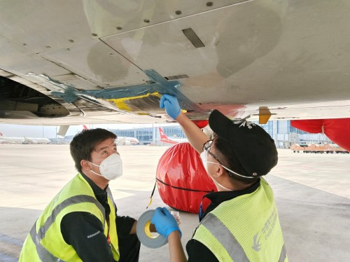 由于溫度較高,機務(wù)人員細心地檢查封存膠帶的粘性,避免由于高溫軟化或脫膠,以及對飛機表面產(chǎn)生腐蝕。雖然在機腹陰涼處,兩位機務(wù)小伙還是感覺層層熱浪