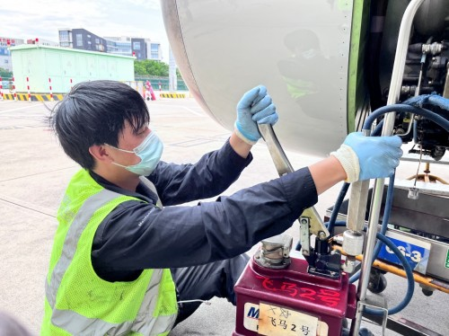 擦拭飛機起落架鏡面是航線保障中很尋常的一項工作,但由于今天外部氣溫較高,吸油棉接觸飛機鏡面后,東航機務(wù)員工的手心瞬間感覺炙熱