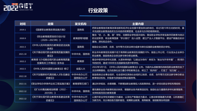 二十大報告里面對教育領(lǐng)域的發(fā)展也提出了明確的目標(biāo),就是要建成教育強(qiáng)國、科技強(qiáng)國、人才強(qiáng)國、文化強(qiáng)國等,尤其在教育、科技、人才方面,這都是跟我們行業(yè)息息相關(guān)的,也是我們行業(yè)機(jī)構(gòu)在業(yè)務(wù)布局和企業(yè)經(jīng)營方面需要重點(diǎn)關(guān)注的方向。