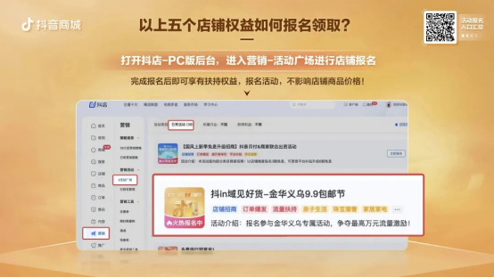 對(duì)于已入駐抖音電商且體驗(yàn)分>4.5的商家,平臺(tái)帶來(lái)了五大店鋪權(quán)益。商家打開抖店-PC版后臺(tái),進(jìn)入營(yíng)銷-活動(dòng)廣場(chǎng),即可報(bào)名領(lǐng)取相關(guān)權(quán)益。