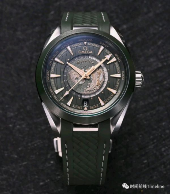 這款世界時的細節(jié)在于,內(nèi)表盤的海洋顏色與手表配色一致,鈦殼是灰色、鋼殼是綠色;陸地則采用激光技術進行著色,金色是高海拔地區(qū)。其中鈦金屬表盤的黑灰色都是由激光歐米茄的地圖是以北極為中心的北半球,我們可以注意到,地圖帶有微微的弧形效果,模仿了真實的地球曲率。盤面上帶地圖的表不少,但像歐米茄做的這么細致真實的,極少。