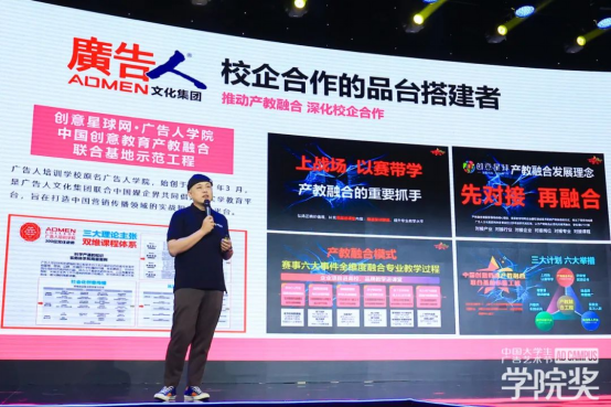 創(chuàng)意星球董事、副總經(jīng)理李春生先生題為《做校企合作的提燈人和馬車夫》的演講。李春生先生詳細(xì)說(shuō)明廣告人文化集團(tuán)的歷程、內(nèi)容生態(tài)圈與平臺(tái)戰(zhàn)略布局,表示:“廣告人文化集團(tuán)發(fā)展至今,積累了深厚的社會(huì)資源。作為熱愛教育事業(yè)的追夢(mèng)人,在各高校紛紛積極探索實(shí)踐教學(xué)、教育改革之路時(shí),廣告人文化集團(tuán)決心盡自己所能幫助高校在實(shí)踐教學(xué)的道路上走得更快。”