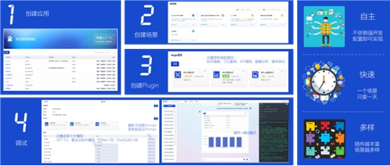 通過智能編排,OctopusX能夠將模型服務、業(yè)務功能、數(shù)據(jù)資源等緊密融合,以滿足不同領域、不同場景的需求。無需強開發(fā),用戶通過配置即可快速實現(xiàn)一個基于大模型的AI場景,僅需4步便能快速響應。在業(yè)務場景數(shù)據(jù)條件具備的情況下,一個場景僅1天即可上線。